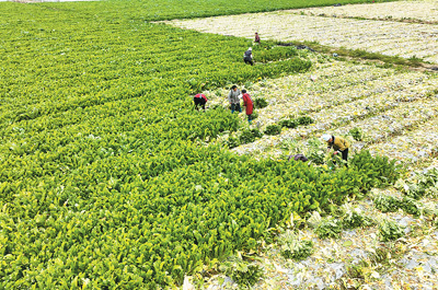 贵州省黔东南苗族侗族自治州榕江县古州镇采取公司供菜苗和收购、村民负责栽种管护的“订单蔬菜”方式,发展蔬菜产业,助力农民增收。图为村民在古州镇车江大坝采收雪里蕻。