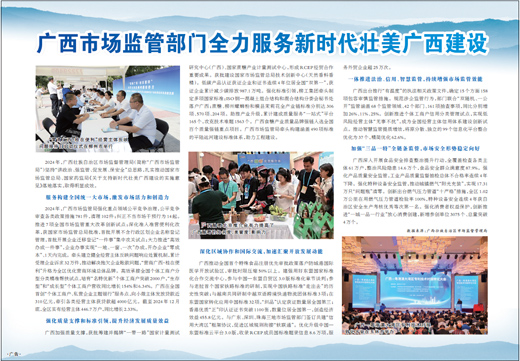 2024年,广西壮族自治区市场监督管理局(简称“广西市场监管局”)坚持“讲政治、强监管、促发展、保安全”总思路,扎实推动国家市场监管总局、国家药监局《关于支持新时代壮美广西建设的实施意见》落地落实,取得明显成效。