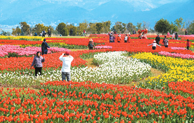 近日,云南省红河哈尼族彝族自治州弥勒市太平湖景区郁金香花竞相绽放,呈现美丽的春日画卷,吸引众多游客前来观赏。图为2月10日,游客在太平湖景区赏花游玩。