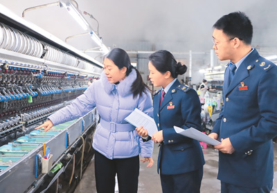 春节过后,为助力企业复工复产、推动优化营商环境,国家税务总局隆林各族自治县税务局工作人员前往辖区企业开展问计问需走访调研活动,了解企业生产经营情况,为企业提供“一对一”个性化服务。图为在广西壮族自治区隆林各族自治县,税务工作人员在广西隆林嘉利茧丝绸有限公司开展调研活动。