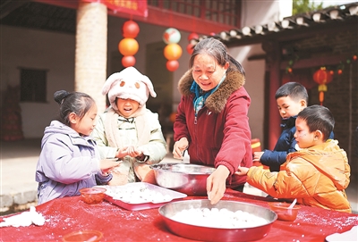 村民与孩子们包汤圆。