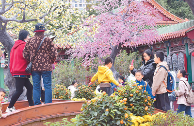 近日,广东省珠海市香洲区圆明新园鲜花盛开,不少游人到访畅游,领略春韵。图为游客在圆明新园赏花拍照。
