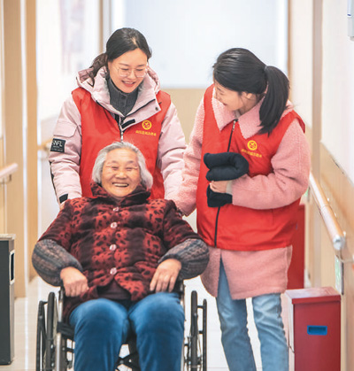 2025年3月3日,江苏省宿迁市宿豫区下相街道南苑星城社区养老服务中心,志愿者在陪老人散心聊天。