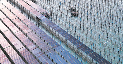 连日来,福建省莆田市湄洲湾北岸经济开发区“渔光互补”光伏电站项目建设正酣。该项目是福建省集中式光伏试点项目,建成后年均发电量可达1.3亿千瓦时。图为项目建设现场。