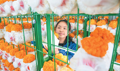 浙江省湖州市德清县莫干山镇加州金耳菌种植基地通过采用智能温室、农业物联网、病虫害绿色防控等先进技术,对金耳菌生长环境精准控制,实现全季节生产,品质和产量双提升,带动农民增收,助力乡村全面振兴。图为近日,工人在采摘金耳菌。