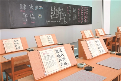 记者在现场看到,展览空间化身成教室,并加入了香港独特的语言特色,如问候语、俗语等。展馆内除了展出徐冰为展览新书写的英文方块字书法作品外,还设有毛笔和字帖,观众可尝试书写和学习了解英文方块字书法。