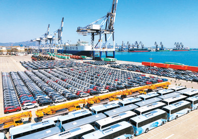3月29日,交通运输部发布数据显示,2024年,全国港口货物吞吐量176亿吨,集装箱吞吐量达3.3亿标箱,继续稳居世界第一;同期,在全球货物和集装箱吞吐量排名前十的港口中,我国分别占八席和六席。图为3月30日,大批国产汽车在山东港口烟台港集结等待装船出口。