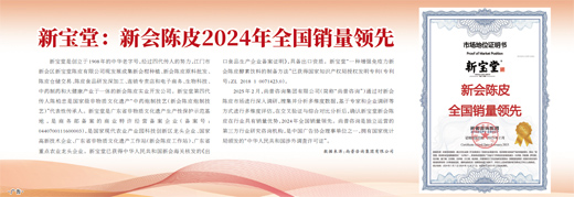 新宝堂是创立于1908年的中华老字号,经过四代传人的努力,江门市新会区新宝堂陈皮有限公司现发展成集新会柑种植、新会陈皮原料批发、陈皮仓储交易、陈皮食品研发深加工、连锁专卖店和电子商务、生物科技、中药制药和大健康产业于一体的新会陈皮实业开发公司。新宝堂第四代传人陈柏忠是国家级非物质文化遗产“中药炮制技艺(新会陈皮炮制技艺)”代表性传承人。新宝堂是广东省非物质文化遗产生产性保护示范基地,是商务部备案的商业特许经营备案企业(备案号:0440700111600003),是国家现代农业产业园科技创新区龙头企业、国家高新技术企业、广东省非物质文化遗产工作站(新会陈皮工作站)、广东省重点农业龙头企业。新宝堂已获得中华人民共和国新会海关核发的《出口食品生产企业备案证明》,具备出口资质。新宝堂“一种增强免疫力新会陈皮酵素饮料的制备方法”已获得国家知识产权局授权发明专利(专利号:ZL 2018 1 0071423.0)。