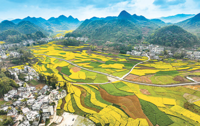 四月一日,贵州省黔西市钟山镇猫山村,田野油菜花盛开,民居、青山、道路交织在一起,美如画卷。