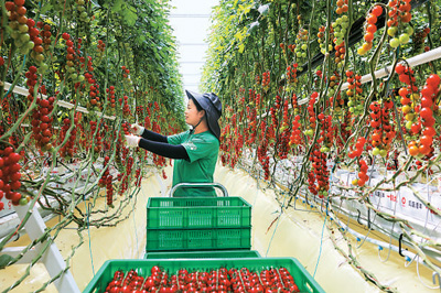 山东省东营市利津县大力发展智慧设施农业,在新一代玻璃温室建设中广泛应用农业信息化技术和智能化生产设备,实现节能、节水、节肥,提升作物品质和产量,为现代农业转型升级和高质量发展注入新活力。图为4月10日,在位于利津县凤凰城街道的凯盛浩丰现代智慧农业示范园玻璃温室内,工作人员在采摘西红柿。