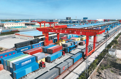 近年来,石家庄国际陆港不断加快中欧班列集结中心建设,提升国际多式联运业务能力,目前开辟的18条国际线路,辐射亚欧50多个国家和地区。今年1至3月份,该国际陆港共开行中欧班列302列,同比增长239%,各项指标均创历史新高。图为4月24日拍摄的石家庄国际陆港集装箱吊装现场。
