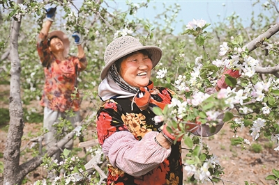 山东省青岛市即墨区段泊岚镇麦戈庄村农民在苹果园为苹果树疏花。