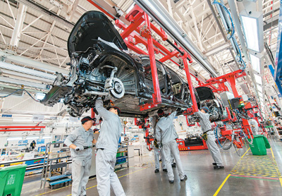 在浙江省金华市新能源汽车小镇零跑汽车智能工厂车间里,工人正在装配新能源汽车。
