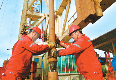 中国石油西部钻探工程有限公司下属准东钻井公司钻井队石油工人正在沙漠深处忙井场进行下钻施工作业。