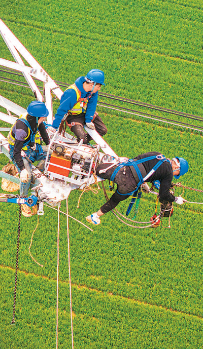 江苏省宿迁市泗洪县车门乡境内,工人在500千伏高压线路迁改现场进行高空作业。