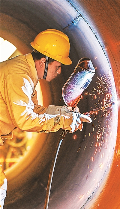 在江西省南昌市方大特钢科技股份有限公司,工人正在车间作业,焊花四溅。