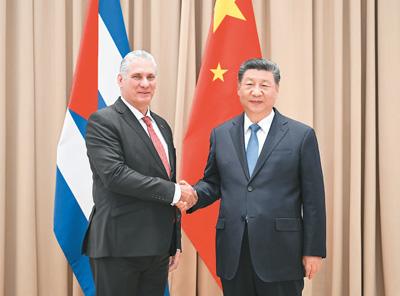 习近平指出,近年来,我同主席同志多次会晤,共同引领中古关系进入政治互信更深厚、战略协作更紧密、民意基础更牢固的新阶段。今年是中古建交65周年,中方愿同古方进一步巩固铁杆情谊,构建更加紧密的中古命运共同体,树立社会主义国家团结合作、发展中国家真诚互助的典范。双方要促进各层级交往、各领域合作进一步走深走实,让高水平政治互信始终成为中古两党两国关系的鲜明标识。中方坚定支持古巴捍卫国家主权、反对外来干涉和封锁,支持古巴经济社会发展。作为全球南方重要成员,双方要在金砖、中拉论坛等框架内加强协调和配合,反对强权政治和单边霸凌,维护国际公平正义。