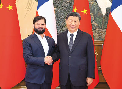 博里奇表示,智利高度重视对华关系。中国已成为智利最重要的贸易伙伴,双方合作造福了两国人民。智方将坚定奉行一个中国原则,期待与中方进一步拓展贸易、投资、人工智能等领域合作,高质量共建“一带一路”,密切人文交流,推动智中关系取得更多实实在在的成果。各国应坚持自由贸易和互利共赢,贸易不应只服务于一国私利,发动贸易战没有出路。智方愿同中方一道,坚定捍卫多边主义和联合国权威,坚持通过对话解决分歧,共同维护国际公平正义。