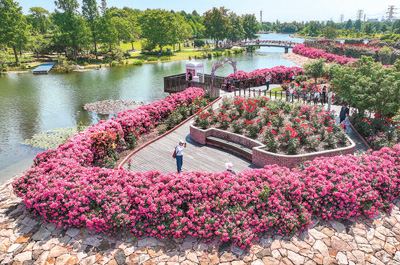 上海辰山植物园现已收集现代月季、古老月季等共1025种,是中国华东地区收集月季资源最丰富的专类园之一。图为近日,上海辰山植物园的月季花竞相绽放,吸引市民游客前来赏花。