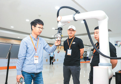 图为智能焊接协作机器人深度体验区现场,与会嘉宾正在了解焊接机器人相关功能。