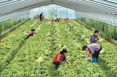 江西省吉安市泰和县积极发展订单有机蔬菜种植,并通过上海“叮咚买菜”平台售卖有机蔬菜,拓宽蔬菜销售范围。图为5月18日,泰和县塘洲镇洲头村订单有机蔬菜种植基地内,农民在采收有机生菜,准备销往上海市场。