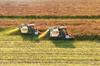 近日,在湖南省益阳市南县罗文村,村民抢抓晴好天气收割、筛选、晾晒油菜籽,田间地头一派繁忙景象。图为五月二十一日,农机手驾驶收割机收割油菜籽。
