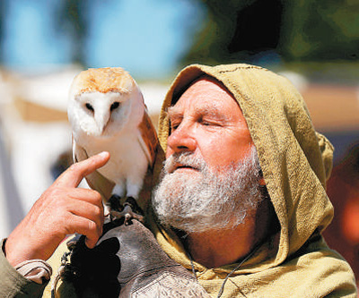 一名身着维京人装束的历史重现表演者和猫头鹰互动。
