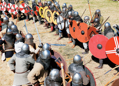 身着维京人装束的历史重现表演者进行战斗表演。