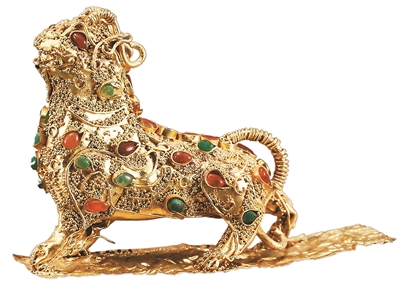 中山穆王刘畅墓出土的一组金器小巧而华美,采用掐丝镶嵌、金粒焊缀等工艺,体现了汉代金器制作技艺的最高水平。掐丝镶嵌金辟邪以虎为原型,前额隆起,角向后垂卷,镶红玛瑙、绿松石为睛,张口露齿,昂首阔步,四肢前伸,长尾拖地。身体以金片捏制成型,角、尾为粗金丝上缠绕细丝,颈前、后背及身体其他部位也点缀红玛瑙、绿松石,体表满饰密集的金粟粒。“这两只瑞兽一只头上有两角,为辟邪,一只头上一角,为天禄。博物馆门前的铜雕就是根据它们的形象制作的,称为‘定吉祥’‘定如意’。”齐增玲说。
