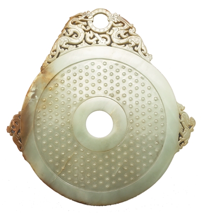 玉璧是古人祭天时的礼器。到了汉代,人们将精美玉器作为身份地位的象征。刘畅墓中出土了不少玉器,其中有两件“镇馆之宝”。东汉龙螭衔环乳钉纹青玉璧高30.5厘米,是目前考古出土最大的出廓玉璧。它采用和田青玉雕成,玉质温润亮泽,璧面上装饰规整的乳钉纹。玉璧上方透雕一龙一螭衔环,两侧也分别透雕一龙一螭,龙腾螭跃,极富动感。