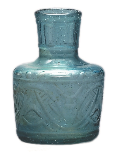 浅蓝色刻花玻璃瓶通体透明光洁,直颈,折肩,筒形腹,平底,颈、腹和底部均有几何花纹。其器形和纹饰均为10世纪伊斯兰玻璃器的流行样式。