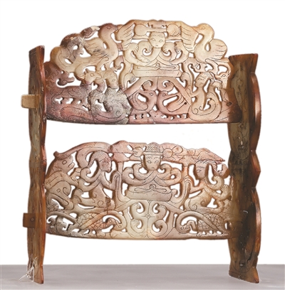 东汉透雕神仙故事玉座屏由4块和田黄玉片插接而成,两侧支架为叠胜形,分别透雕青龙和白虎。中间两屏片略呈半月形,两端有榫插入架内,透雕神仙人物、祥禽瑞兽。上屏正中为西王母,分发高髻,凭几端坐,旁有羽人、朱雀、九尾狐、三足乌等;下屏正中为东王公,发后梳,旁有羽人及熊、玄武等。玉屏风和座屏常见于记载,但考古出土的实物仅此一件,这也是考古发现的最早将人物、动物、景物合雕在一起的玉器,被列入《禁止出国(境)展览文物目录》。