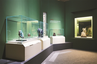 展厅里,混鱼龙化石、巨鬣狗化石、义马银杏化石等古老的化石,讲述着地球生命的悠久历史。五光十色的矿物晶石,让人领略中华大地物华天宝、资源宏富。一簇硕大的粉红色菱锰矿石好似绚丽绽放的鲜花,给人强烈的视觉冲击。此展品2009年发现于广西壮族自治区苍梧县,是中国著名的菱锰矿标本之一,被称为“中国皇后”。