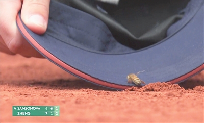 郑钦文停下脚步,向身后的球童做了个手势,现场转播镜头也对准了红土上的蜜蜂。球童用帽子轻轻接住它,将它放进场边的花丛中。这个有趣的小插曲,赢得了全场最温柔的掌声。