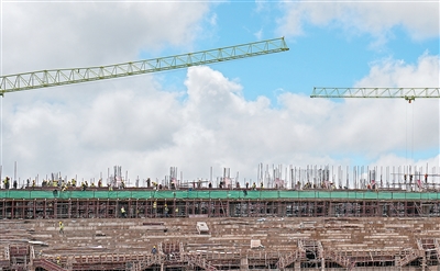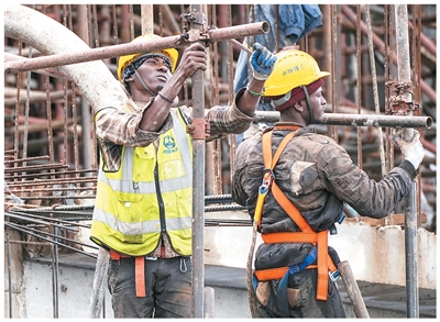 工人在坦桑尼亚阿鲁沙综合体育场项目上工作。