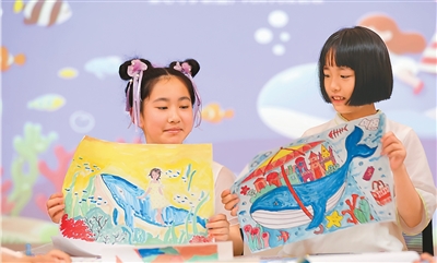 一场以“童心护蓝海 两岸共成长”为主题的周末绘画课堂近日在福建省福州市鼓楼区水部街道闽都社区举办。在志愿者的指导下,来自闽台两地的少儿通过绘画形式,绘制心中的“海洋家园”,从而增进海洋生态保护意识。图为小朋友正在交流绘画作品。