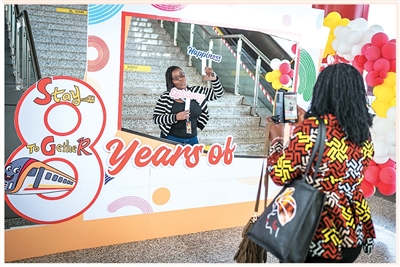 一名女子在肯尼亚标轨铁路安全运营八周年纪念板前拍照。