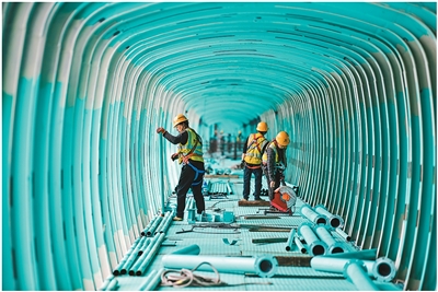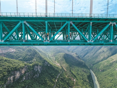 建设者在贵州花江峡谷大桥上安装观景长廊。