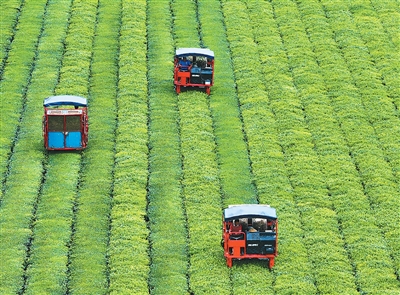 江西省吉安市泰和县积极推进智慧农业发展,通过引进智能采茶设备,有效提高了采茶效率、降低了茶叶生产成本。图为6月16日,工人在泰和县泰和垦殖场生态茶园驾驶采茶机采收夏茶。