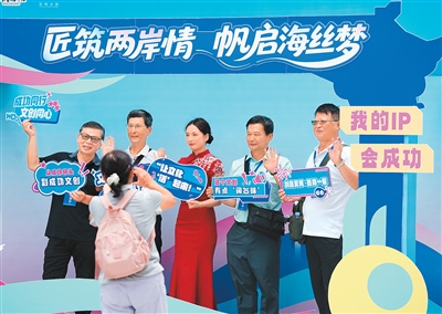 参会人员在“匠筑两岸情 帆启海丝梦”的展板前合影。