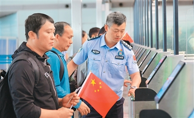 图为北京边检总站民警帮助旅客通过快捷通道入境。