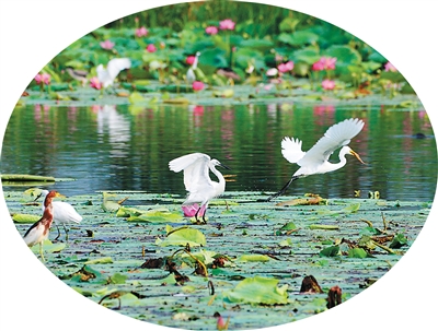 平静的湖面顿时生动起来,水流交汇碰撞处,鲤鱼跃出水面。无人岛或近岸的树丛、芦苇丛、香蒲丛中,苍鹭、斑嘴鸭伫立、游弋,仿佛都在“围观”这场期盼已久的补水。