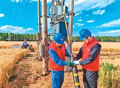 “三夏”时节,河北省石家庄市元氏县投入1300余台联合收割机,助力全县38万余亩小麦颗粒归仓。为确保麦收等农业生产用电安全,当地供电部门积极组织乡村电力服务队走进田间地头,开展安全用电宣传、供电线路隐患治理等工作。图为当地电力工作人员给供电线路拉线加装护套。