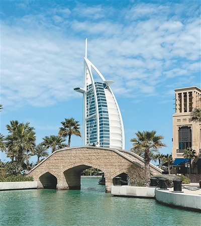 中国的印记,便如沙砾间闪烁的金粒,不经意间就跳入眼帘。帆船酒店——迪拜最耀眼的明珠,是香港设计师周娟的手笔。远远望去,这座建筑犹如一艘扬帆起航的白色帆船,其轮廓设计借鉴了中国传统帆船的优雅线条,却以现代玻璃幕墙技术重塑,“停泊”在碧海黄沙间。走近细看,建筑与倒影在海面上相映成趣,完美诠释了“白色帆船停泊湖岸”的诗意意象。步入大堂,迎面是一面气势恢宏的红色幕墙,浓郁的中国红在阿拉伯风格的建筑中格外醒目,仿佛一团跳动的火焰。抬头仰望,40米高的中厅令人屏息,中央悬挂着一座巨大的旋转雕塑,其设计灵感源自金陵文化精髓,在光影变幻中演绎东方美学韵律。阿拉伯传统建筑智慧与中国古典园林美学在此完美融合,创造出令人惊叹的空间体验,无声诉说着丝路两端文明的古老回响。