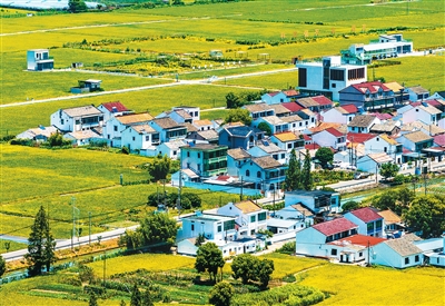 7月5日,浙江省宁波市镇海区九龙湖镇,民居与水稻、河流相互映衬,构成一幅生态优、产业兴、乡村美的画卷。
