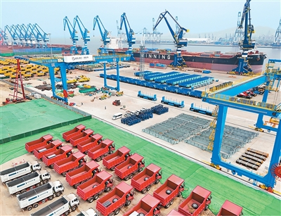 今年1至6月,山东港口烟台港中非班轮对非洲国家设备物资发运量达285.8万吨,同比增长80.7%,创历史新高。目前,烟台港中非班轮航线已扩展至非洲20多个国家和地区,运输货种高度契合非洲国家基建和民生需求,成为中非经贸合作的桥梁与纽带。图为大批出口非洲的物资在山东港口烟台港集结装船。