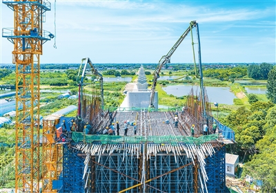 江苏省苏州市吴中区,建设工人在通苏嘉甬高速铁路(苏州段)进行施工作业。