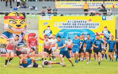 近日,第十届海峡两岸(福建)青年英式橄榄球交流赛暨2025年全国触式橄榄球分区赛(福州站)在福州海峡奥林匹克体育中心举办。为期2天的赛事活动,吸引来自福建、台湾以及浙江、山东、重庆等地超过60支队伍、1000多名运动员参加。图为橄榄球成人撞式组别比赛现场。