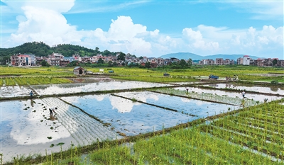 时下,正值湖南省永州市新田县农业生产“双抢”时节,当地农民冒着酷暑抢收、抢种,确保不误农时。近年来,新田县倡导实行烟稻轮作模式,增加土地的利用率和产出率,最大限度发挥土地潜力,有效抑制病虫灾害,减少农药化肥使用量,促进农业丰产增收。图为新田县新圩镇蒋家村,村民在田间进行晚稻插秧。