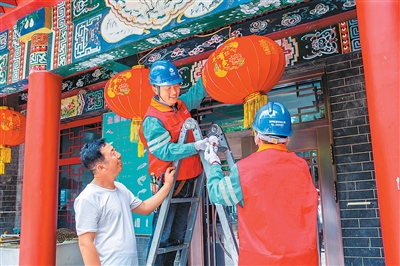 为满足查干湖文旅产业发展需求,夯实查干湖电网网架,打造“零碳查干湖”示范区,国网松原供电公司工会近日组织服务队走进吉林省松原市查干湖景区,对景区内的电采暖、充电站、换电站、机井灌溉等用电负荷进行动态监控和精细化管理,确保景区高质量用电。图为电力人员对景区红灯笼灯泡进行更换作业。